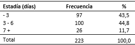 La estadía promedio en UCI fue de 3,6 días (con una desviación típica de 2,4 y coeficiente de variación de 0,7), lo que hace referencia a una estadía no distribuida de forma homogénea en la muestra de estudio por la presencia de pacientes que estuvieron como mínimo 24 horas en el servicio y como máximo 18 días, resultados que muestra la tabla 4.