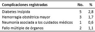 La morbilidad materna se caracteriza por presentarse en edades adecuadas para el desarrollo del embarazo, la mayor parte de las pacientes admitidas procedieron del Salón de Parto, con una estadía en Unidades de Cuidados Intensivos por debajo de lo reportado en la literatura; la complicación más frecuente fue la diabetes insípida y existe relación estadística entre los diagnóstico de ingreso y la aparición de complicaciones.