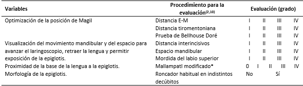 Entre los predictores de dificultad en la evaluación laringoscópica se han propuesto variables clínicas de forma aislada. La presencia de dos o más de estas se ha utilizado para la evaluación y permite identificar algunos pacientes con mayor riesgo de presentar alteraciones anatómicas, lo que ofrece pertinencia a las escalas y modelos de evaluación predictiva.