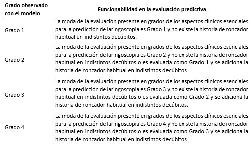 Todos los especialistas consideraron conveniente el modelo, en tanto les sirve para la evaluación predictiva de la laringoscopia convencional. Además, puede ser aplicado en la práctica clínica, puede someterse a la validación en otros servicios o unidades, y ayuda a resolver un problema de la práctica social.