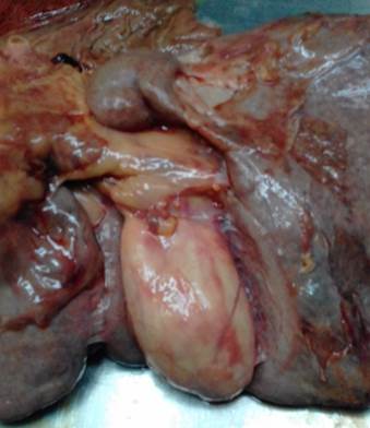 Paciente con número de historia clínica: 289025, masculino, de 73 años de edad, con antecedentes de asma bronquial, que fue ingresado en el servicio de Medicina Interna por cuadro respiratorio, interpretado como una bronconeumonía, para lo cual llevaba tratamiento antibiótico. Al cuarto día de su ingreso falleció. Cuando se le realizó la autopsia se reveló como causa directa de muerte una bronconeumonía bilateral severa abscedada, además se constató: esplenomegalia (18,5 x 7,8 cm) con absceso que ocupa tercio inferior del bazo, esteatosis hepática marcada y vesícula biliar blanca nacarada de 11 x 5,5 cm, que a su apertura se observa salida de líquido claro de aspecto mucoso, presencia de dos formaciones litiásicas cada una de 1,3 cm de diámetro, pared de 0,7 cm y pérdida total de aspecto afelpado de la mucosa (Figura 1).