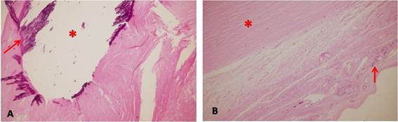 En el estudio histológico con hematoxilina y eosina, se observaron los siguientes elementos: escasas fibras musculares atrapadas en abundantes haces de tejido conjuntivo entre los cuales se observan de forma difusa, depósitos amorfos basófilos que se corresponden con depósitos de calcio. Se observó epitelio mucoso escaso atrófico. (Figura 2A y 2B).
