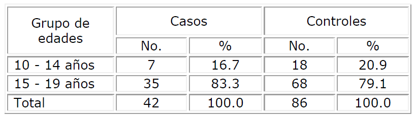 En la distribución de los casos y controles según grupo de edades (Tabla 1), predominó el grupo de edades de 15 a 19 años en ambos, para un 83.3% de casos y un 79.1% de controles.