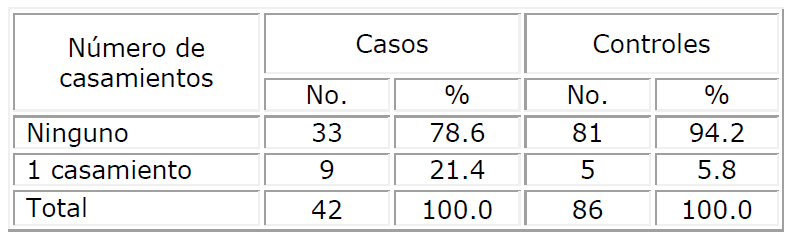 De acuerdo al número de casamientos, (Tabla 2) predominaron las adolescentes sin ningún matrimonio 94.2 % en el grupo de casos, contra 78.6 % (controles), resultó significativo la diferencia entre ambos grupos por lo que fue 3.2 veces más probable que una adolescente soltera tuviera un embarazo.