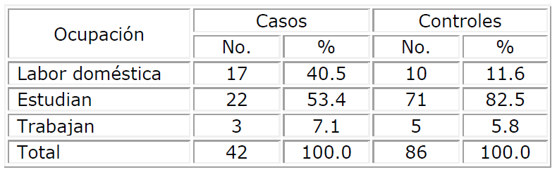 La Tabla 3, en relación con la ocupación, se observaron diferencias significativas, pues predominó el número de adolescentes que estudian para un 53.4 % en los casos y un 82.0 % en los controles, obteniéndose que es 3.2 veces más probable que una adolescente que se encuentre estudiando quede embarazada que las que realizan labores domésticas y/o trabajen, constituyendo esto un factor de riesgo.