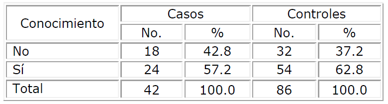 En la distribución de casos y controles de acuerdo al conocimiento de los Métodos Anticonceptivo (Tabla 4), no se encontraron diferencias significativas en cuanto a esta variable representando un 57.2 % los casos y 62.8 % los controles con conocimiento de los mismos.