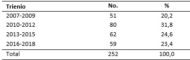 Method: a descriptive, cross-sectional study was carried out. The universe was the 252 patients with histopathological diagnosis of the disease. The following variables were studied: triennial involvement, age, sex, origin, oral topography, clinical extension and morphological type.