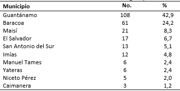 En la Tabla 3 se observa que la frecuencia el cáncer bucal fue superior en los pacientes procedentes de los municipios Guantánamo (42,9 %) y Baracoa (24,2 %).