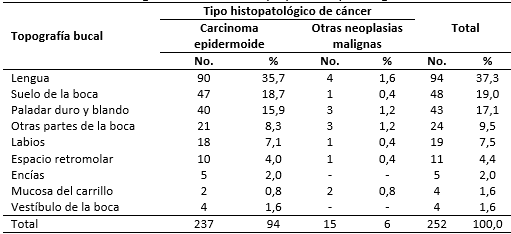 Results: the highest percentage of the patients belonged to the male sex (69.4%), were over 60 years old (69.8%), came from the Guantánamo municipality (42.9%). The lesions were located mainly in the tongue (37.3%) and floor of the mouth (19.0%) and extended to the buccal complex (52.8%). Squamous cell carcinoma was the most common histopathological type (94%).