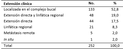 Respecto a la extensión clínica, el cáncer bucal se localizó en el complejo bucal (52,8 %), como se observa en la Tabla 5.