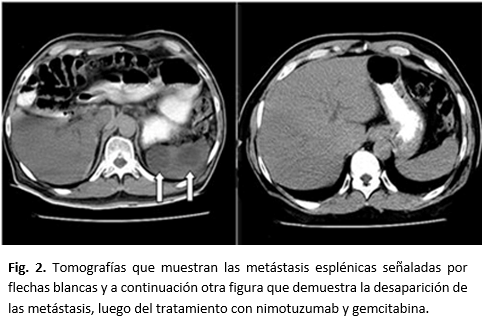 RESUMO: Paciente do sexo masculino, 69 anos, apresentou colestase extra-hepática, perda de peso, astenia e anorexia, história de pancreatite crônica, diabetes mellitus e hipertensão arterial, diagnosticada com adenocarcinoma do pâncreas com metástases esplênicas. Uma colecistojejunostomia foi realizada com jejuno jejunostomia porque o tumor era irressecável. Foi incluído no ensaio clínico IIC RD-EC166 e tratado com nimotuzumab e gencitabina. Nos estudos evolutivos, as imagens metastáticas observadas antes do tratamento não foram apreciadas, o que pressupõe a utilidade desses medicamentos para seu controle. Não foram encontradas referências sobre o assunto na literatura nacional e internacional consultada