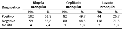 Se evidenció que del total de casos el 61,8 % la biopsia resultó positiva, sin embargo, este por ciento descendió en el cepillado bronquial y el lavado bronquial al obtenerse un 49,7 y un 26,7 % de positividad, respectivamente. De manera opuesta sucedió con la negatividad que fue incrementándose significativamente desde un 35,8 % con la biopsia, un 48,5 % con el cepillado, hasta un 71,5 % con el lavado bronquial. Es importante señalar que en un mismo paciente se pudo obtener más de una técnica positiva, negativa o no útil (Tabla 2).