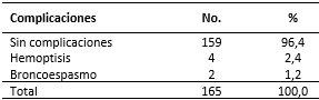 La mayoría de los pacientes 96,4 % no sufrió complicaciones durante ni después de realizada la broncoscopia (Tabla 3), sin embargo, un número reducido de ellos presentó hemoptisis 2,4 %, que aunque ligera, es un cuadro clínico que requiere una vigilancia más estricta. El broncoespasmo se produjo sólo en el 1,2 % de los enfermos.