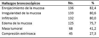Resultados: Se encontró que 103 pacientes presentaron diagnóstico de malignidad, la biopsia bronquial presentó un 61,8 % de positividad, el 94,6 % de los pacientes no presentaron complicaciones y el enrojecimiento de la mucosa representó un 82,4 %.