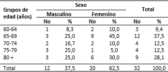 En cuanto a la edad y al sexo (Tabla 1), hubo un predominio del grupo de 65-69 años y del sexo femenino en un 37,5 y 62,5 %, respectivamente.