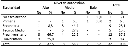 En relación a la Tabla 2, el 37,9 % de los adultos mayores alcanzó el preuniversitario y el nivel de autoestima general fue medio (56,2 %), seguido del alto con un 37,5 % y solo en el 6,3 % fue bajo. El mayor predominio de los casos con nivel de autoestima medio había alcanzado la secundaria (44,4 %) y el técnico medio (27,8 %), mientras que el 66,7 % y 25,0 % con autoestima alta, poseían el preuniversitario y la universidad, respectivamente.