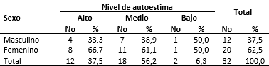 Quedó demostrado que el mayor porciento de adultos mayores con nivel de autoestima medio y alto eran mujeres con un 61,1 y 66,7 %, respectivamente, mientras que el 50,0 % de autoestima bajo le correspondió a ambos sexos (Tabla 3).