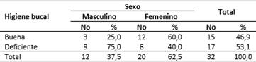 La higiene bucal deficiente predominó en los adultos mayores estudiados (Tabla 4), pues fue detectado en el 53,1 % de ellos. También se demostró que el 75,0 % de los hombres poseían una mala higiene bucal, mientras que en el 60,0 % de las féminas era buena.