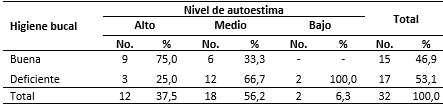 Method: A descriptive-cross-sectional study was carried out in the 32 older adults who attended the Periodontics Department of the Teaching Provincial Stomatological Clinic from Santiago de Cuba, which met the inclusion criteria: over 60 and older, of both genders, who gave their consent to participate in the research. The variables were studied: age, sex, education, level of self-esteem and oral hygiene.