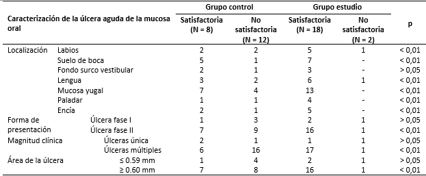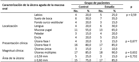 El análisis de la tabla 1 permite establecer que el porcentaje de pacientes que conformaron el grupo control y el grupo estudio no difirieron respecto a la localización, área, forma de presentación y magnitud clínica de la úlcera aguda de la mucosa oral.