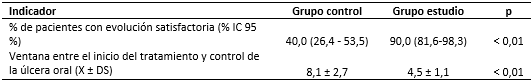 Resultados: La evolución satisfactoria de este tipo de úlcera se precisó en el 40,0 % de los pacientes que conformaron el grupo control y el 90,0 % de los que integraron el grupo estudio (p < 0,01). En este último grupo la ventana entre el inicio del tratamiento y control de la úlcera oral fue de 4,5 ± 1,1 días y para el primero fue 8,1 ± 2,7 días (p < 0,01).