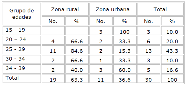 Al distribuir a las embarazadas según grupos de edades y zonas de residencia, el grupo de edad de mayor porcentaje fue 25 a 29 años con 43.3 % (Ver Tabla 1). De las 30 embarazadas el 63.3 % residían en la zona rural y en la zona urbana 36.6 %.