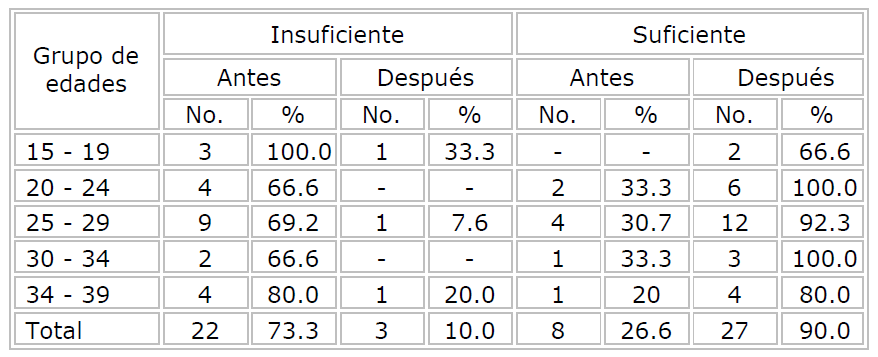Al relacionar el nivel de conocimientos con la edad se observó que del total de las embarazadas el 73.3 % (Tabla 2) poseían un insuficiente nivel de conocimiento sobre salud periodontal antes de la intervención siendo el grupo de edad más representativa el de 34-39 años, luego de la capacitación, el 90 % de las embarazadas poseían suficiente nivel de conocimientos.
