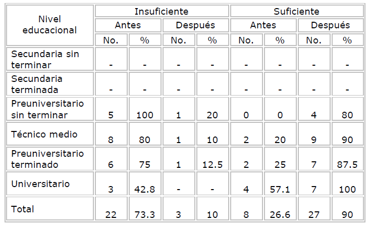 Los niveles de escolaridad que predominaron en la muestra fueron técnicos medios, preuniversitarios terminado y universitarias respectivamente (Tabla 3), esto nos facilitó la capacitación lo que aumentó su nivel de conocimientos transitando de una evaluación insuficiente antes de la intervención a suficiente después de la intervención, correspondiendo los mayores porcientos a las que tenían nivel escolar de universitarias con un 100% seguidas de los técnicos medios con un 90%.