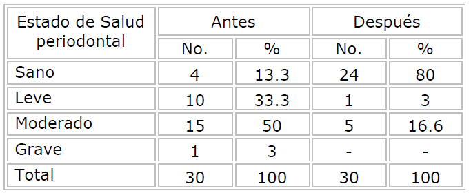 Al evaluar el estado de salud periodontal de estas embarazadas está en la categoría de moderado con un 50 % seguido de la categoría de leve con 33.3 % antes de la intervención, después de la intervención de las 25 embarazadas en categoría de moderada y leve 20 pasan a la categoría de sana, quedando 1 en categoría leve y 5 en moderada, es de destacar que la paciente en categoría grave pasa a categoría moderada.