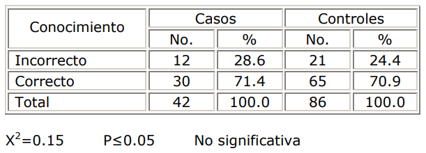 La Tabla 1 refleja que la mayoría de las adolescentes sí tenían un correcto conocimiento acerca de la edad óptima para salir embarazada, 71,4% de los casos y un 70,9% de los controles.