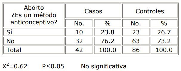 La Tabla 2 nos muestra que en ambos grupos predominó el no ser el aborto un método anticonceptivo para un 76,2% los casos y 73,2% los controles.