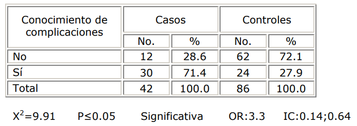 En la Tabla 3, en cuanto al conocimiento de las complicaciones del embarazo en las adolescentes, el grupo de casos que el 71.4 % respondió si conocerlas. En el grupo control por el contrario predominó el no conocimiento (72.1%).