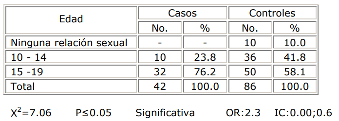 En cuanto a la edad de la primera relación sexual (Tabla 4) se observaron diferencias significativas entre grupo de casos (76.2 %) y controles (58.1 %), por lo que es 2.3 veces más probable que ocurra un embarazo en las edades entre 15 a 19 años donde las adolescentes tienen su primera relación sexual.