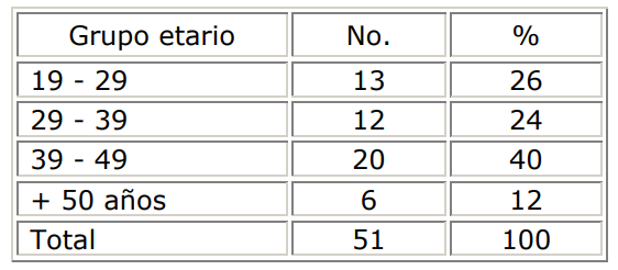 Los trabajadores están expuestos a múltiples riesgos para la salud ocupacional, es por ello la necesidad de identificar los peligros y riesgos con la finalidad de gestionarlos con efectividad.7 Se encuestó a un total de 51 trabajadores atendiendo a la edad, Tabla 1, predominando el grupo edades de 39-49 años, con 20 trabajadores, para un 40 %, seguido del grupo de 19–29, con 13 lo cual representó un 26 % del total de la muestra. El sexo femenino tuvo mayor predominio sobre el sexo masculino con un total de 49 féminas para un 96%.