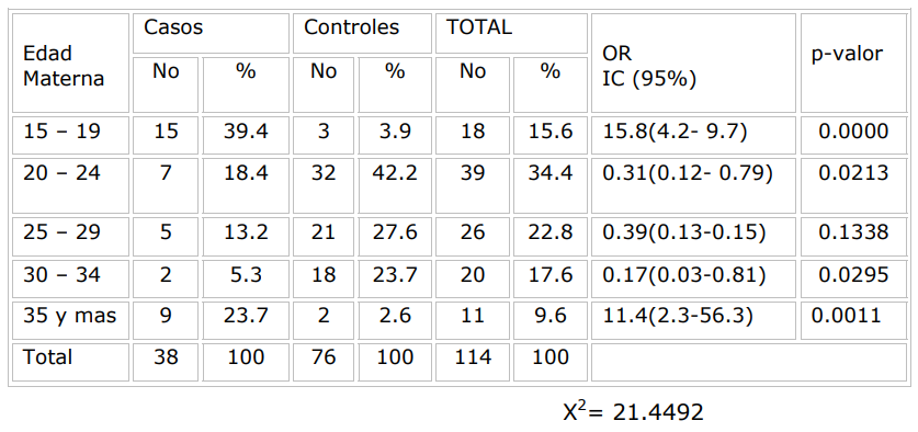 En este trabajo se encontró predominio del grupo de madres entre 15 y 19 años, determinándose que tienen 15.8 veces más probabilidad de tener hijos que desarrollen sepsis precoz que los demás grupos de edades, le continúa en orden de frecuencia las madres de 35 y más años con 11.4 veces más probabilidad de tener un niño que desarrolle sepsis.