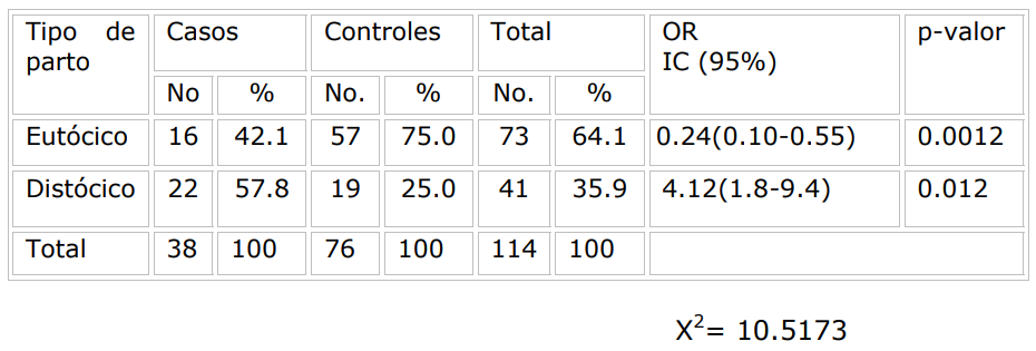 Al analizar la variable tipo de parto (Tabla 2), hubo predominio de los partos distócicos en un 57.8 % de los casos y en los controles solo en un 25.0 %.