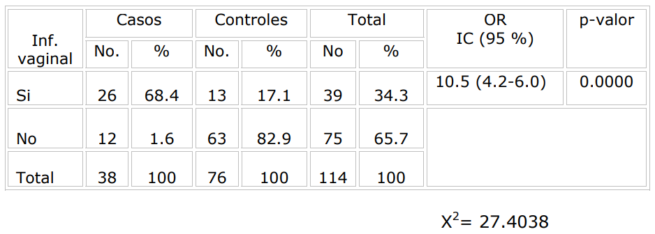 El predominio de la ruptura prematura de membrana y el bajo peso al nacer se asocia al mayor índice de infección vaginal.5,8 Sin embargo, en esta investigación se encontró que esta variable actúa como un factor protector.