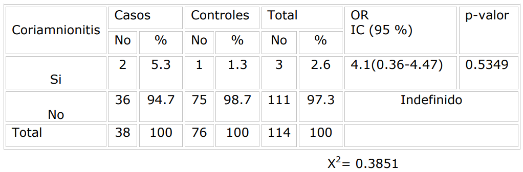 La corioamnionitis a pesar de constituir un factor de riesgo de gran asociación con la sepsis precoz en otros estudios, se encontraron 2 casos para un 5.3 % y solo uno de los controles tuvo antecedentes de haberla tenido (Tabla 4), no se comportó como un factor de riesgo según los cálculos efectuados.