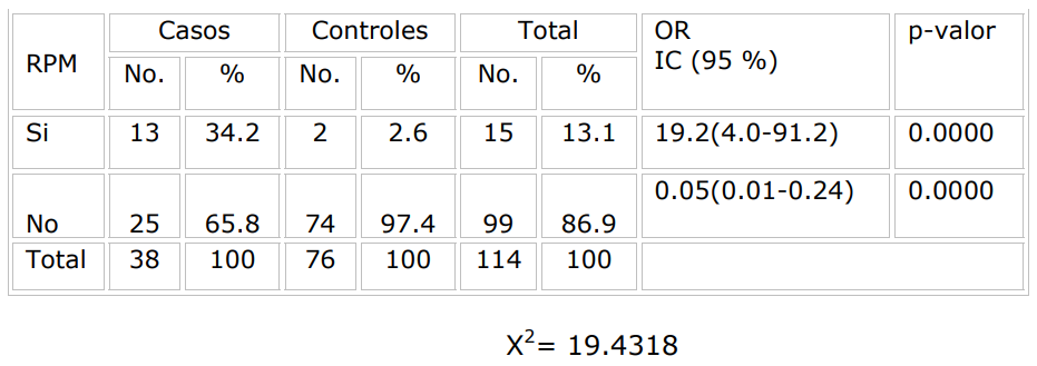 La rotura prematura de membranas (RPM) es otra de las variables estudiadas, se encontró que predominaron en los casos y los controles las madres sin antecedentes de haber tenido una ruptura prematura de membrana,(Tabla 5).