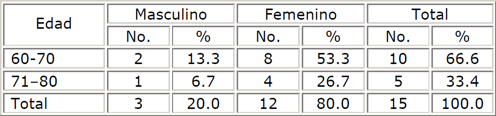 Como se puede observar en la Tabla 1 el grupo de edad que predomina es de 60 a 70 años con 66.6 % seguido del 71 a 80 años (33.4 %) y el sexo predominante es el femenino con 80 %.