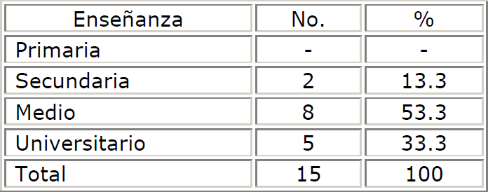 En la Tabla 2 se observa que el nivel de escolaridad predominante es el medio con el 53.3 %, seguido del universitario con 33.3 %.