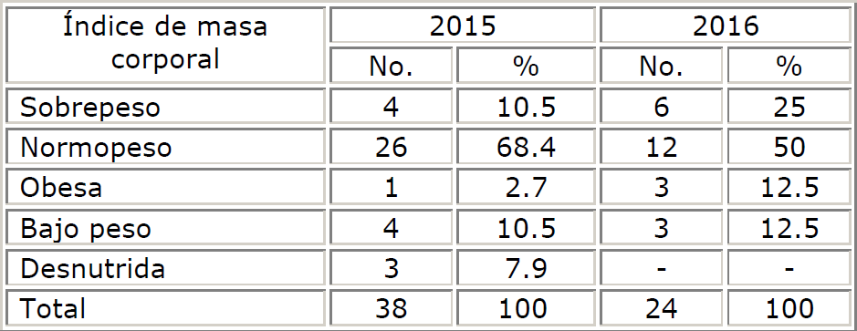 En el estudio hubo un incremento en las mujeres con índice de masa corporal, (Tabla 2), dentro de límites normales (normopeso), en el año 2015 hubo 26 pacientes para un 68.4 % con respecto al año 2016 que hubo un descenso 12 para un 50 % pero siguió siendo el grupo predominante, esto puede deberse a que la cultura nutricional de la población ha ido mejorando lo cual unido al nivel escolar alcanzado ha mejorado este indicador.