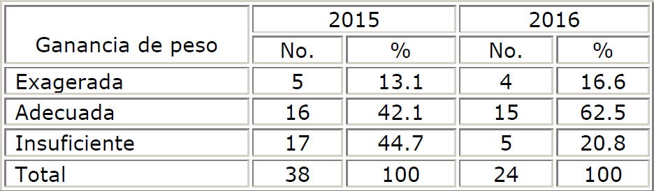 En la Tabla 3 se observa una discrepancia entre los años 2015 y 2016 donde hubo un incremento en la ganancia insuficiente de peso, en el año 2015 (17 (44.7 %)) en relación con el año 2016 donde hubo un incremento de la ganancia adecuada 15 (62.5 %).