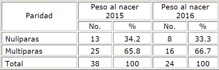 En cuanto a la relación entre paridad y peso al nacer muchos autores han demostrado una relación marcada entre la primiparidad y la incidencia de bajo peso al nacer. En esta investigación se encontró que la multiparidad incide directamente en la prevalencia de nacimiento de niños bajo peso al nacer, se coincide con Marrero Santos12 y Maturell Comas.13