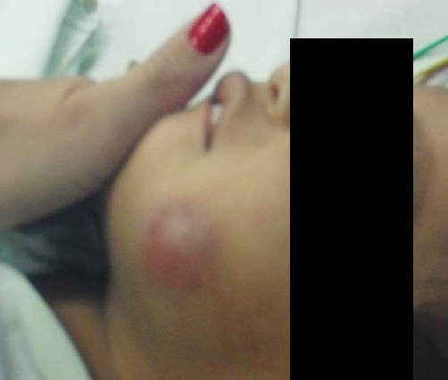 Se describe el caso de un niño de 1 año, con antecedentes de buena salud anterior, procedencia urbana, que ingresó por presentar varias lesiones en piel, localizadas en la región geniana facial izquierda, el muslo derecho y el abdomen, sin causa aparente de traumas, picaduras de insectos o alergias medicamentosas o comestibles, y fiebre de 38 0C.