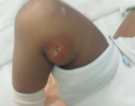 Sólo fue interesante al interrogatorio que la madre trabajaba en un hospital, en el área de laboratorio de microbiología, pues convivía en buenas condiciones de vivienda y económicas. Las lesiones presentaban un halo enrojecido, no doloroso, sin prurito, que rápidamente se convirtieron en ulceraciones crateriformes, algunas con contenido purulento y necrótico (Figuras 1,2 y 3).