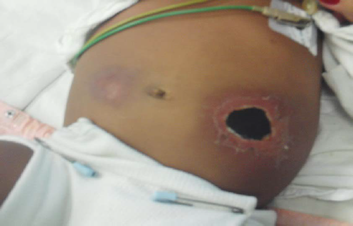 El tratamiento quirúrgico jugó un papel importante en la evolución clínica y luego en la reconstrucción de la piel crateriforme, sobre todo en abdomen, evitando peritonitis y septicemias después del egreso.13