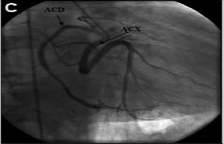 CD: normal, CI: Origen anómalo a nivel de la arteria pulmonar, siguiendo su trayecto por dentro del seno de Valsalva, relleno retrogrado a través de las colaterales de la coronaria derecha.