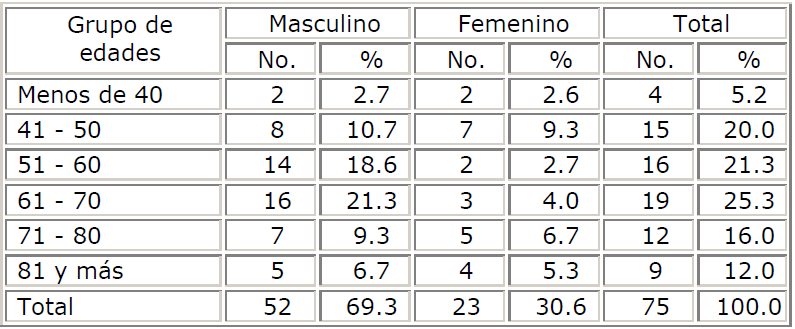 En la Tabla 1 se muestra la caracterización del universo de estudio según grupos de edad y sexo donde la prevalencia del sexo masculino con 52 paciente para el 69.3 %, siendo el grupo de edad de 61 a 70 años el más representado con 19 pacientes para el 25.3 %, influyendo en el mismo sexo con 16 pacientes (21.3 %).