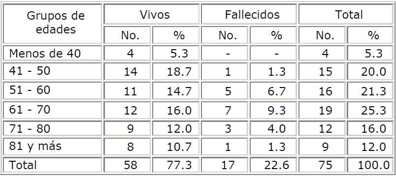 Nótese que los pacientes comprendidos en el grupo de edades de 61-70 años presentan elevada mortalidad con 7 pacientes, seguido del grupo de 51-60 años con 5 pacientes, el predominio de los egresados vivos corresponde al grupo de edades de 41-50 con 14 pacientes.